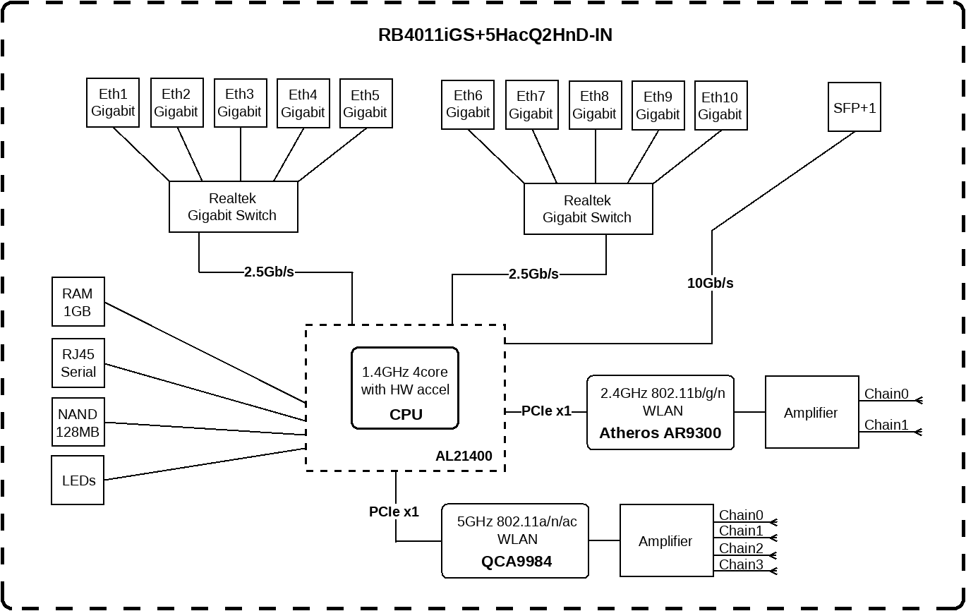 (RB4011iGS+5HacQ2HnD-IN) RouterBOARD 4011iGS+5HacQ2HnD-INPowerful 10xGigabit port router with a Quad-core 1.4Ghz CPU, 1GB RAM, SFP+ 10Gbps cage, dual band 2.4GHz / 5GHz 4x4 MIMO 802.11a/b/g/n/ac wireless and desktop caseRB4011iGS+5HacQ2HnD-IN (WiFi model) is dual band, four chain unit with a supported data rate of up to 1733 Mbps in 5GHz. For legacy devices, the unit also has a dual chain 2GHz wireless card installed in miniPCI-e slot. |