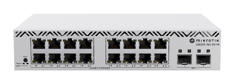 (CSS318-16G-2S+IN) Cloud Smart Switch 318-16G-2S+IN with SwitchOSWith 16 Gigabit Ethernet ports and 2 SFP+ 10G uplink ports, you get all the connectivity you need without unnecessary bulk. Stack two units side by side in a single 1U rack space for even greater flexibility and scalability.The CSS318-16G-2S+IN is a perfect fit for setups where 24 ports are too many and 8 ports just aren’t enough. Its compact 10-inch form factor and cost-effective design make it the ideal solution for small and medium-sized offices, home networks, or rackmount environments where space and efficiency are key. With 16 Gigabit Ethernet ports and 2 SFP+ 10G uplink ports, you get all the connectivity you need without unnecessary bulk. With its versatile mounting options, the CSS318-16G-2S+ can be installed in 10-inch racks, standard 19-inch racks, or even side-by-side—fitting two switches in a single 1U 19-inch space. Effortless Configuration with SwOS Configuration is effortless with MikroTik’s lightweight SwOS. Accessible directly from your web browser, SwOS gives you the core functionality of a managed switch and more: Port-to-port forwarding Broadcast storm control MAC filtering VLAN configuration Traffic mirroring Bandwidth limitation Adjustment of MAC and IP header fields Energy Efficient and Reliable The CSS318 consumes just 10W without attachments and up to 13W under full load, keeping your network reliable while saving power. Compact, Scalable, and Affordable Compact, scalable, and simple to configure — the CSS318-16G-2S+IN is ready to enhance your network at an unbeatable price. |