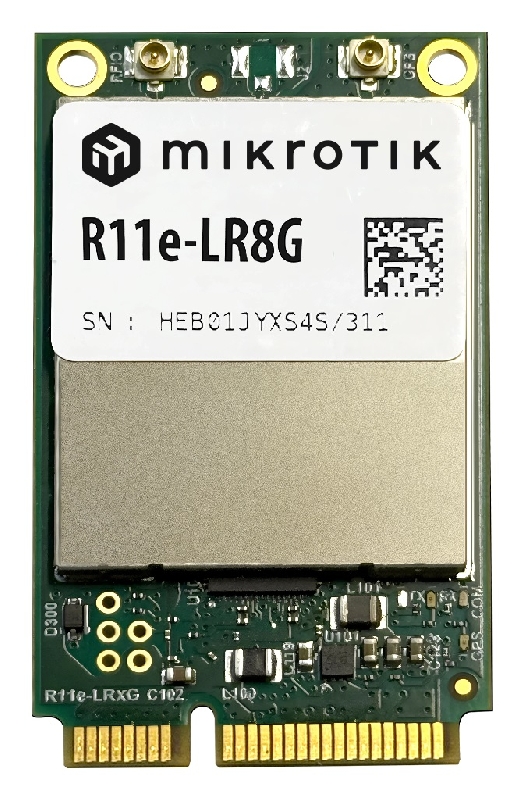 (R11e-LR8G) LR8G miniPCI-e card for 863-870 MHz frequencyThe simplest way to add LoRa® connectivity to any MikroTik device with a mini PCIe slot. Perfect for tight budgets without compromising performance, this card features: Enhanced 868MHz Rx sensitivity for effective long-range communication, ensuring reliable long-range communication Compact, efficient design for easy integration into existing setups Cost-effective performance for IoT projects of any scale Integrated GPS chipThe simplest way to add LoRa® connectivity to any MikroTik device with a mini PCIe slot. Perfect for tight budgets without compromising performance, this card features: Enhanced 868MHz Rx sensitivity for effective long-range communication, ensuring reliable long-range communication Compact, efficient design for easy integration into existing setups Cost-effective performance for IoT projects of any scale Integrated GPS chip |