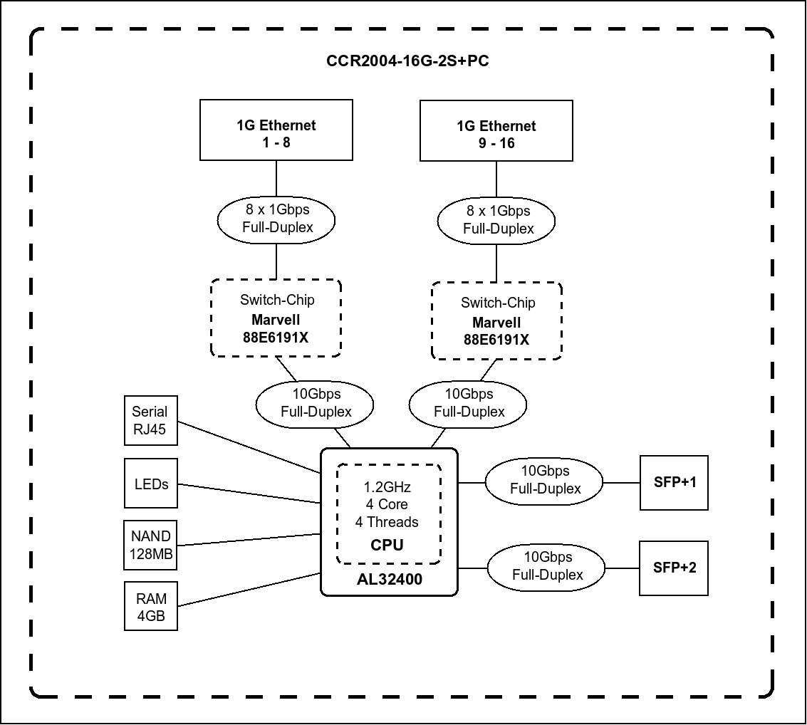 (CCR2004-16G-2S+PC) Cloud Core Router 2004-16G-2S+PC with RouterOS L6, passive cooling enclosureUp to 300% faster than the previous CCR1009 routers - in a blissful silence! Luxury you deserve for the price you can afford. 16x Gigabit Ethernet ports, 2x10G SFP+ cages.Īsa rokasgrāmata User Manuals MikroTik SFP module compatibility table Like the other models in CCR2004 series, this CCR also features the Amazon Annapurna Labs Alpine v2 CPU with 4x 64-bit ARMv8-A Cortex-A57 cores. While this CPU is running at 1.2 GHz, the router can be 3x as fast than the previous generation CCR’s. This is the silent powerhouse. Enjoy all the power of a real CCR in peace and quiet. Get rid of all the hum and buzz in your office, studio, server room or homelab without sacrificing the performance! The new router has 18 wired ports, including 16x Gigabit Ethernet ports and two 10G SFP+ cages. It also has a RJ-45 console port on the front panel. Each group of 8 Gigabit Ethernet ports is connected to a separate Marvell Amethyst family switch-chip. Each switch chip has a 10 Gbps full-duplex line connected to the CPU. The same goes for each SFP+ cage - a separate 10 Gbps full-duplex line. Boards come with 4GB of DDR4 RAM and 128MB of NAND storage. So as you can see - no bottlenecks. As long as the CPU can handle the processing, all ports can reach wire speed. And this CPU is a beast that can handle a lot. If we look at the performance, you can see that it is trading blows with our CCR1009. The best part? This brand new CCR is among the most affordable options out there - not only within the CCR series, but on the market in general. One of the most common ways to use this device would be: Gigabit Ethernet ports for the internal network; SFP+ ports for downlink and uplink. The perfect all-in-one solution for small and medium-sized businesses. Easy and efficient. With the new CCR2004, you can take your office network to the next level. Without breaking the bank. |